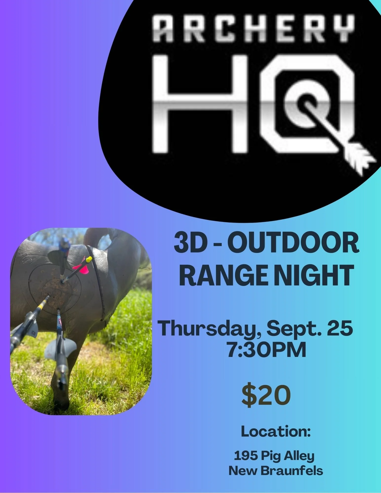 Join us for a fun evening of shooting 3D targets and hanging out with other archers. Located at our 3D range at 195 Pig Alley, New Braunfels. $20. Call the shop for any questions 830-221-8904.